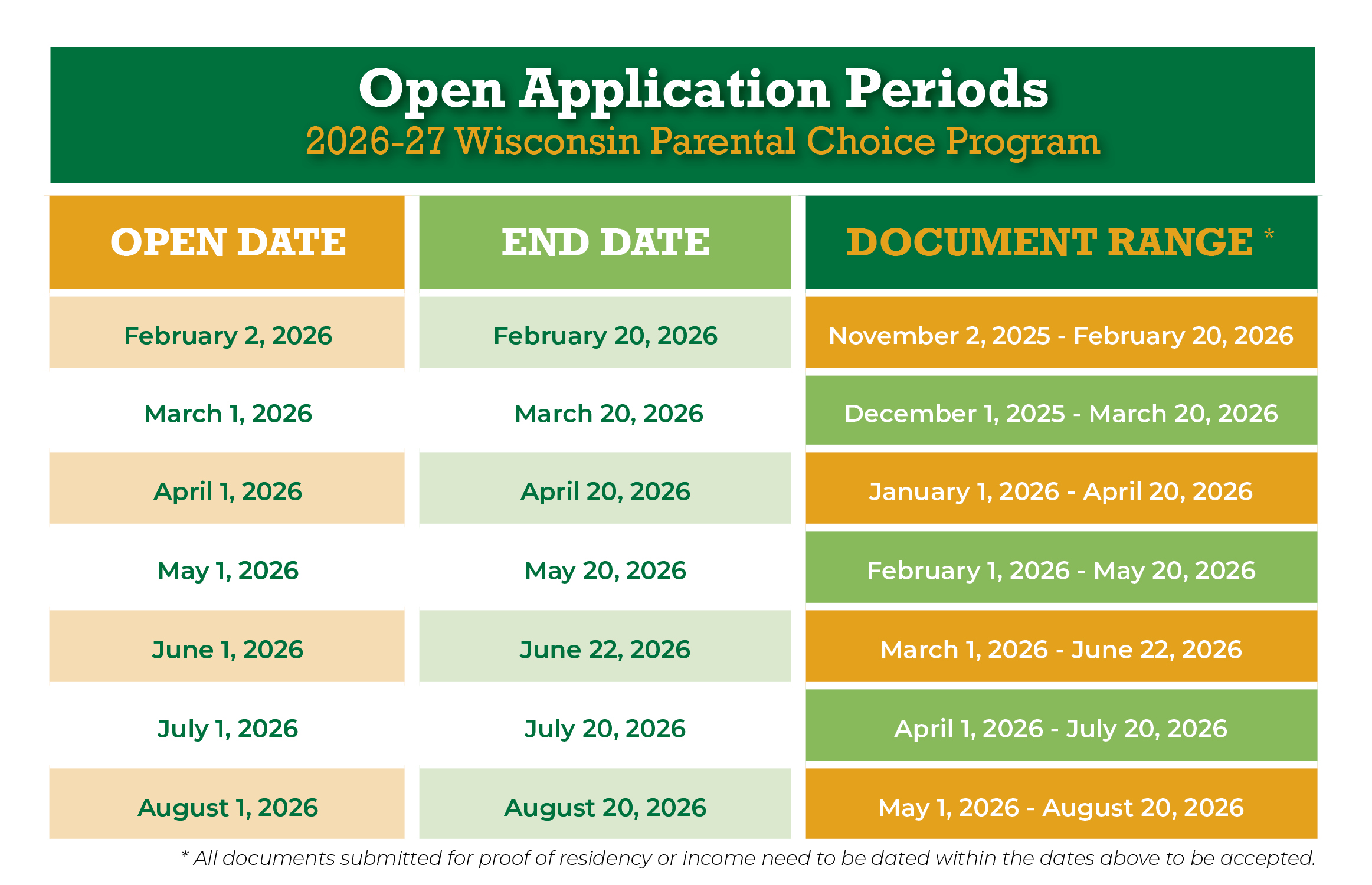 Beginning with the 2026-27 school year, the Wisconsin Parental Choice Program application periods have been changed and expanded. Our full-day 4K program at St. James Elementary School is now included in the Wisconsin Parental Choice Program.